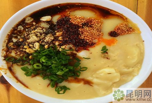 稀豆粉米線是臨滄特色風味小吃之一。制作以豌豆粉、米線為原料,配以佐料而成。將豌豆粉調成漿過濾后煮成稀粥燉好備用,在燙好的米線上蓋以稀豆粉,拌上芝麻、生姜、油辣椒、花椒油、蒜泥、青蒜葉、味精、醬油等,食之味香可口。