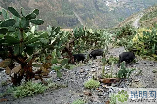 滿目的仙人掌,仙人掌營(yíng)養(yǎng)價(jià)值很高,當(dāng)?shù)氐牟叵阖i喜歡啃食嫩仙人掌。