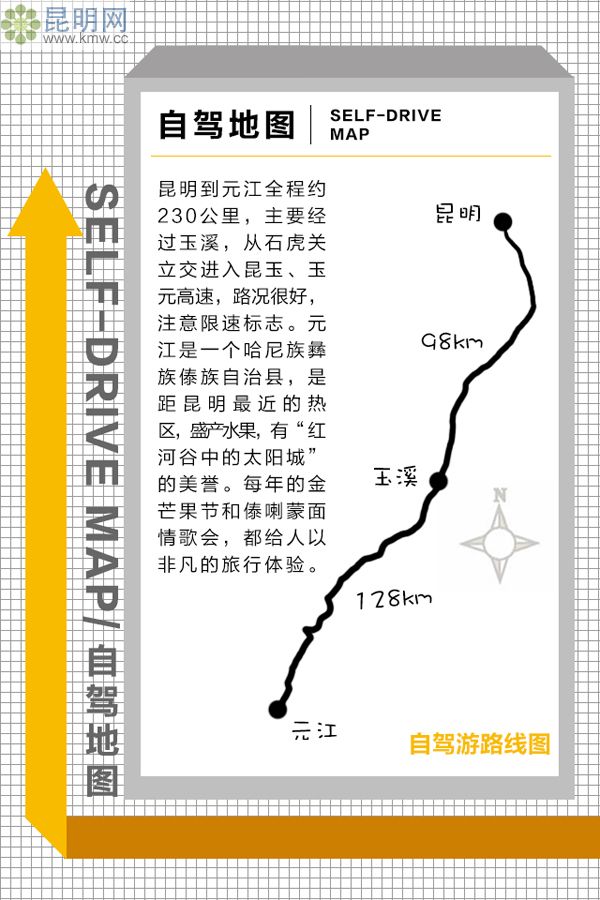 昆明到元江全程約230公里,主要經過玉溪,從石虎關立交進入昆玉、玉元高速,路況很好,注意限速標志。元江是一個哈尼族彝族傣族自治縣,是距昆明最近的熱區,盛產水果,有“紅河谷中的太陽城”的美譽。每年的金芒果節和傣喇蒙面情歌會,都給人以非凡的旅行體驗。