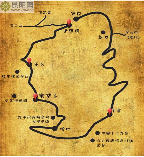 甲寅村距離縣城約37公里,是世界上最大的哈尼寨子。作夫民族特色村是至今保存最完好的蘑菇房村落,已有1000多年的歷史。他撒梯田(近萬畝梯田間點綴有棕櫚、櫻花),綠樹格梯田四季秀美,均是拍攝日落最好的地方。十二龍泉可以體驗哈尼族的水文化。無門票  免費參觀。