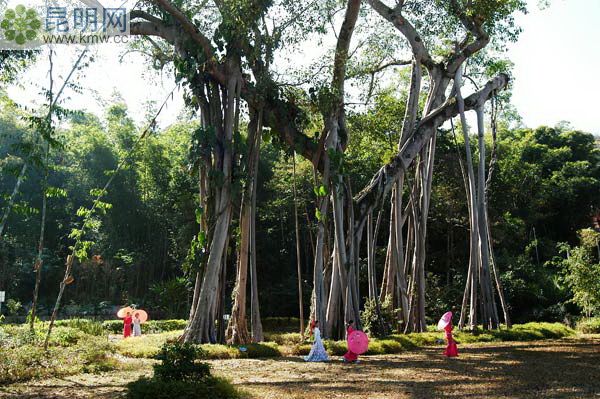 位于打洛鎮邊境貿易區內的曼掌寨子旁,是一棵古榕樹,有900多年的樹齡,共有31個根立于地面,樹高70多米,樹幅面積120平方米,除主干外,還從枝干上生出許多柱根插入土中,支柱根又變成了另一棵樹,形成樹生樹,根連根的壯觀景象,成為熱帶雨林中的一大奇觀。門票:50元,電話:0691-5561504