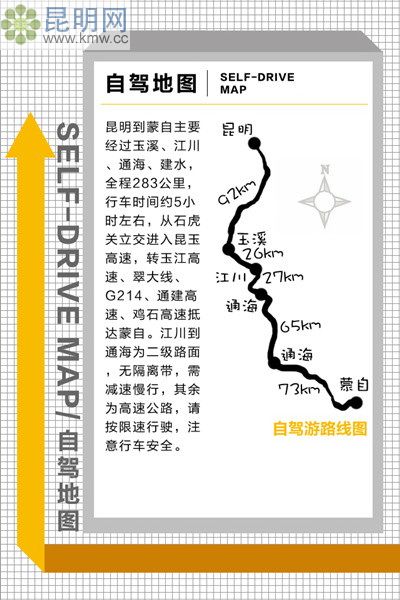 昆明到蒙自主要經(jīng)過玉溪、江川、通海、建水,全程283公里,行車時間約5小時左右,從石虎關(guān)立交進入昆玉高速,轉(zhuǎn)玉江高速、翠大線、G214、通建高速、雞石高速抵達蒙自。江川到通海為二級路面,無隔離帶,需減速慢行,其余為高速公路,請按限速行駛,注意行車安全。