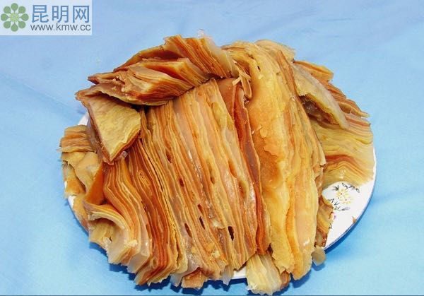 南澗風(fēng)味食品小吃之一,主料為當(dāng)?shù)赝愣狗郏脗鹘y(tǒng)工藝經(jīng)多道工序制成,色澤金黃,厚薄均勻,伴以辣子油、蔥花和蒜等佐料而食,冷熱均可,酸辣爽口,甘香宜人。