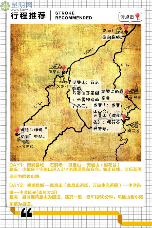 南澗縣城-40km-鳳凰山(鳳凰山茶場(chǎng)、萬(wàn)畝生態(tài)茶園)-42km-小灣東鎮(zhèn)-10km小灣風(fēng)光(庫(kù)區(qū)大壩)