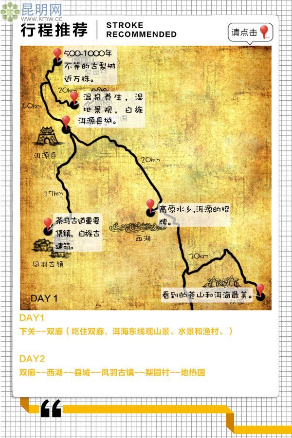 雙廊-30km-西湖-20km-縣城-17km-鳳羽古鎮(zhèn)-40km-梨園村-20km-地?zé)釃?/p>