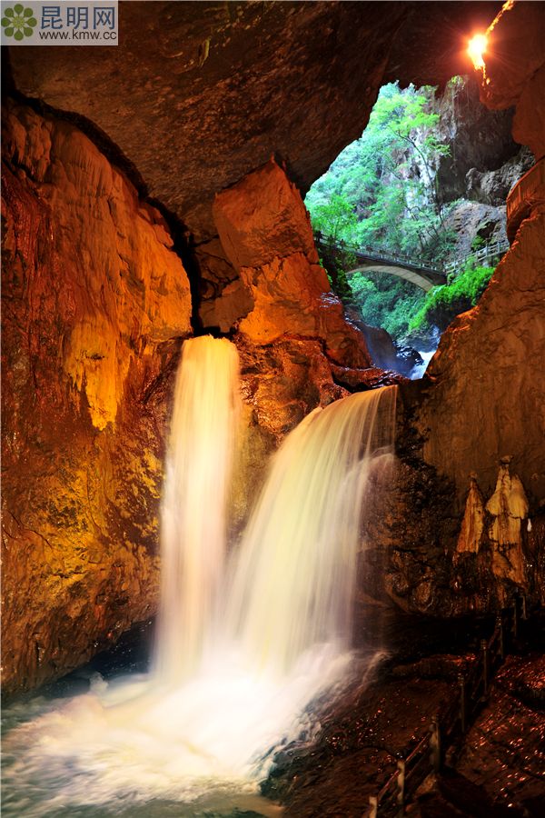 是地下瀑布。九鄉母親河在撲向臥龍洞時,被河中巨石從中劈開,一分為二,瀉入壑底,形成兩條巨大的瀑流,一雌一雄,故名雌雄瀑。