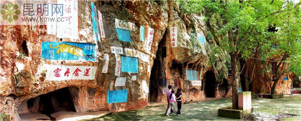 溫泉螳螂川東側是雄峙磊落的陡崖翠屏,怪石嶙峋,撥地而起,聳入云端,這就是環云崖。在石壁上鐫刻著明、清、民國時期遨游溫泉的墨客騷人,學者名流盛贊溫泉的長歌短句,或大或小,或粗或細,行、楷、草、隸,應有盡有,如珠璣遍落,琳瑯滿目,形成了130多幅內容豐富、規模宏大的摩崖石刻群。一幀幀匠心別具的字畫,就是一件件珍奇的歷史文物,可沿著公路參觀。