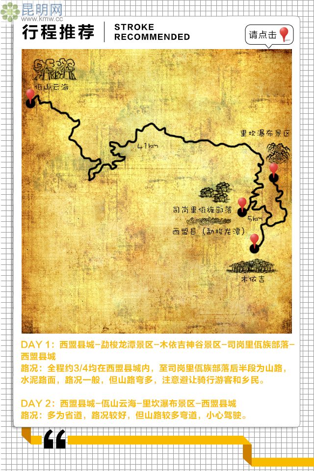 Day 2 西盟縣城(S315) 41km 佤山云海(S315) 40km 里坎瀑布景區(qū)(S315) 38km 西盟縣城