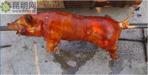 烤豬以小豬為主要原料,宰殺后,去其肚雜,刮凈豬毛,涂上香料、香油,以通桿由豬股部刺入,由眼部穿出,置于燒旺的炭火上烘烤,直至皮色呈黃色時為止。烤熟的小豬皮色金黃而脆、肉嫩醇香,是招待貴賓的理想佳品。