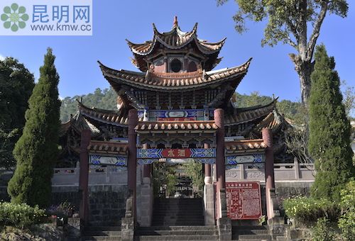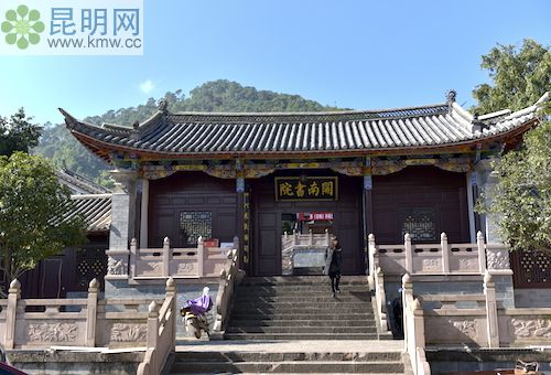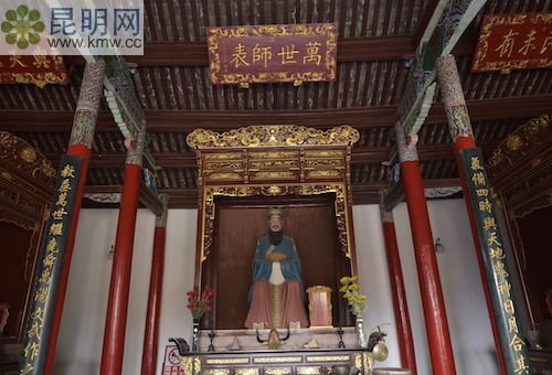 兩邊廂房里有景東縣的各種文物館藏。里面有土司墓出土的文物陳列,也有景東歷史文物陳列,它是一本凝固的教科書。它從一個側面證明景東文化的淵源。大成門兩側還是廂房,內有景東教育發展歷史展和孔子生平展等展室。大成殿屋檐下的斗拱和彩畫大量采用冷色調的青綠色,這與深紅的墻壁、朱紅門扇配金黃色浮雕的暖色調形成對比,在視覺上也增加了檐的深度。