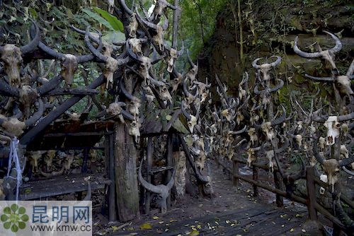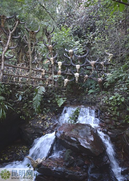 延湖邊木質步道去龍摩爺圣地,在山上原始森林里,延小溪瀑布有臺階上山,門口有佤族木鼓,山路2側全是水牛頭骨和原來放人頭的木樁,不過山清水秀,不會有恐怖的感覺。圣地中心是一顆樹,放滿牛頭骨,總數大概3600個,還有圖騰供桌。龍潭據說和緬甸的龍潭一公一母,西盟的是母龍潭,所以說有龍女的傳說。