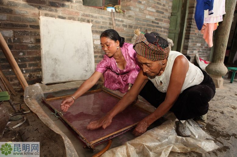 造紙需要收集原材料,每年七、八月間,人們到房前屋后或寨子附近用刀將構樹樹干砍倒或將大的樹枝砍下來,細心地把樹皮剝下,然后到小河邊把從樹干上剝下來的構皮經水洗去粘液,再用小刀把外面那層黑色的外皮全部刮掉,只留下里面白色的嫩皮,樹皮剝好后,就在小河邊進行第一次清洗,這時必須將黑色外皮處理干凈,否則會影響紙的質量。清洗完后挑回家進行第二步工藝流程即纖維的分離,將清洗好的構皮上火塘灰、灶灰,使植物纖維原料分散成纖維狀,火塘灰先用篩子將火塘灰過篩,去掉火炭及其他雜物,然后將泡軟的構皮置于其中,讓火灰均勻地附著在構皮上(火灰的質量與所燒木柴有關,木柴質地越好,火灰的堿性就越強),使構皮得到充分的堿化(火灰的堿性還與紙的質量有關,堿性越強紙就越白),然后將已經上灰的構皮置于已盛水的鍋中,蓋上麻布,用中火蒸煮。不管時間長短,只要構皮煮透了就行。