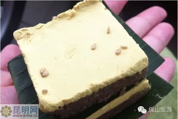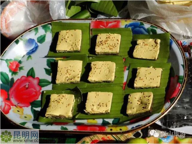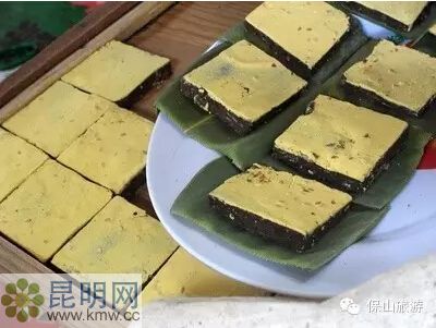 其實松花糕不是什么佳肴,而是一種采用天然的松花粉加紅豆做成的小吃(當然也有用黃豆的)。松花粉被科學界譽為天然食品之冠,富于營養,其中蛋白質含量為牛肉和雞蛋的七倍,而且以游離氨基酸的形式存在,易被消化吸收。它對各種疾病有奇妙的功能。常食某些花粉對貧血、腦功能紊亂、用腦過度和幼兒大腦遲鈍、毛細管強度不足等有療效。更有強筋健骨、增強勞動耐力、增進食欲和延年益壽的功能。松花糕,最上面一層是厚厚的黃色天然松花粉,松花粉上面撒有一些芝麻。下面一層褐紅色的是夾著紅豆碎塊的紅豆沙。再下一層黃色的松花粉和褐紅色的豆沙,最下面一層是制糕粉。騰沖當地人的松花糕是一板一板地做出來的,每一板大約30×60公分大小,再用小刀劃成3×3公分左右的小塊,每塊也就半公分多厚。它整整齊齊的擺在一只淺底的大木盒子里,上面用一張塑料薄膜蓋著。有食客買時,攤主就會拿出一只小鋁皮鏟子,小心翼翼的鏟起幾塊。為了保證松花糕的新鮮,攤主每天只做一盒,賣完便回家,第二天再做再賣。