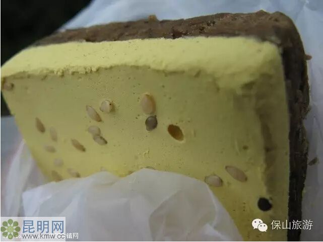 和順最出名的松花糕是藺大媽做的,上過了多家電視臺,己經成為和順古鎮的一張名片,吸引著各地游客慕名而來。走進和順古鎮,只見里邊直街曲巷、石色蒼蒼,民居棟棟、暖屋靜院,小橋流水、古意渾然。游客很多,當地人照樣過著悠閑自在的農家生活,不受外界侵擾。也有擺放的地攤,也有兜售的小商。外人尋覓藺大媽的糕,門口沒有。就在洗衣這邊,買松花糕的有好幾個呢,很多人走到跟前也不知道。問人,找到目標,小推車鋪面就在龍潭邊上,大媽笑吟呤地站在那里。那松花糕長得很可愛,方方正正、蛋黃色的一塊塊,精致小巧,讓人舍不得一口吞掉;新鮮的松花糕很軟,含一口在嘴里,溫潤香軟的身子于唇間悄然溶化,微微的松子香、淺淺的清甜味,一如滿溢的愛戀沁出唇邊,久久不散……松花糕具有果仁風味,清甜、油潤、入口易化、不粘牙、不糊口。吃完松花糕,嘴唇上方往往都會留下半圈蛋黃色粉末,伸出舌頭輕舔,恍如隔世般的再度回味。下次再來——只是下次不知要等到什么時候,松花糕就給你留下了長久的念想。