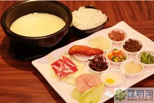 3、過橋米線,是云南著名的風(fēng)味小吃。過橋米線主要以湯、肉片、米線再加作料做成。湯用肥雞、豬筒子骨等熬制以清澈透亮為佳,將雞脯、豬里脊、肝、腰花、鮮魚等切成薄片,擺入小碟,米線則以細(xì)白、有韌性者為好;同時(shí)備有豌豆尖、黃芽韭菜、嫩菠菜等。進(jìn)餐時(shí),以大"海參碗"盛湯,加味精、胡菽、熟雞油。湯滾油厚,不冒一絲熱氣。湯上桌后,將鴿蛋磕入碗內(nèi),繼而將肉片氽入湯中,輕輕一攪,霎時(shí)變得雪白、細(xì)嫩。然后再放入鮮菜、米線,配上辣椒油、芝麻油等,便可食用。