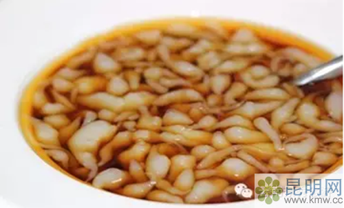 4、玫瑰米涼蝦:米涼蝦是用大米制漿煮熟,用漏勺漏入涼水盆中而成。因頭大尾細(xì)形似蝦,故此得名。用它配入糖水,加入玫瑰糖,是夏季解渴佳品,成品香甜軟嫩,人口冰涼。