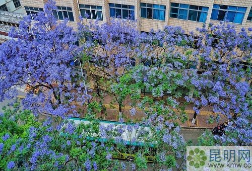 每年春夏之交的昆明,藍花楹是昆明街頭最美麗的花卉之一,錐狀紫色花序配上羽狀復葉,花雨飄落顯得浪漫十足,跟其花語“在絕望中等待愛情”一樣富有詩意。昆明最具特色的藍花楹景觀道,便是從學府路口順教場中路走,一直到二環北路入口一段約2公里的路段上。數百株藍花楹在這條道路上作為行道樹,長勢良好,樹的胸徑基本達20厘米,已形成一條全國聞名的藍花楹景觀林蔭大道。