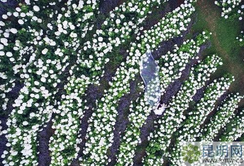 白色的安娜系花球,有一個變色的過程,最初它們會泛著淡淡的綠色那時的景色雖壯觀卻難以往“浪漫”一詞上沾邊。漸漸地,它們褪去綠色變成全身潔白的花團,好似毛毛蟲破繭成蝶一樣,它們化身成了白白軟軟的花中精靈,看上去就異常可愛。