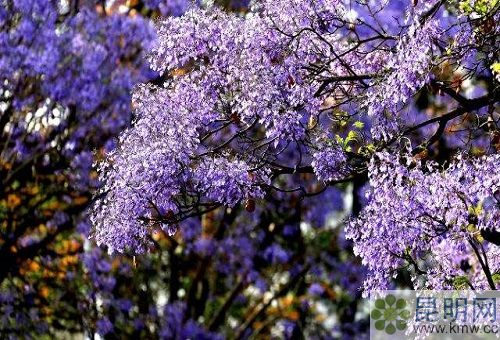 1984年,中科院昆明植物研究所首次從阿爾及利亞引種了該樹種,與藍花楹同時引進的還有鳳凰木。這兩種景觀樹都高大優美,花開的時候也特別漂亮。藍花楹在昆明長勢很好,一般在4至6月份都會開花。花期只有一個月左右。