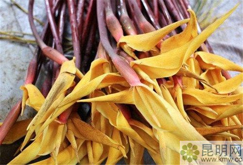 芭蕉花是云南人桌上特有的美味,大部分家常菜的做法是芭蕉花炒肉。芭蕉花本身有苦澀的味道,需要經過人工揉搓、水汆等工序去除澀味,因此賣相不及前面幾種,卻是難得的美味。除了芭蕉花炒肉外,香酥芭蕉花、芭蕉花煎蛋、包燒芭蕉花也是云南風味菜品中不得不提的幾樣。