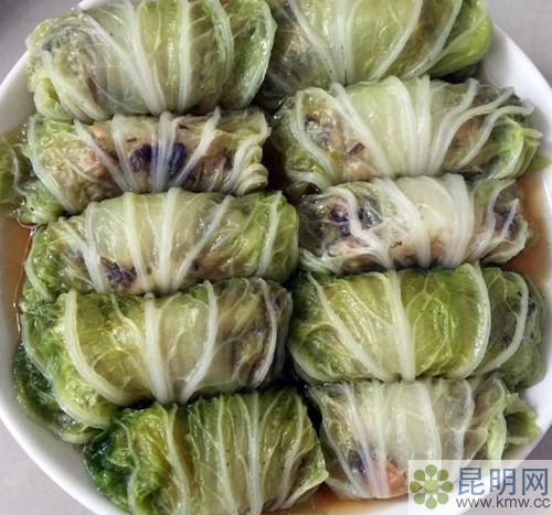 脊肉中摻入一點肥肉,再加入胡椒、蛋清、鹽、味精等調料做成的餡,口感松軟嫩滑、鮮而不膩,然后再用新鮮剔透的包菜包裹起來蒸熟,再放入事先蒸熟的小冬瓜中盛盤,造型新穎獨特,一上桌就能聞見陣陣清香。這道菜還要配上一碗用生抽、朝天椒、大蒜、香菜、糖和醋精心調配的蘸水,對辛辣程度喜好不同的食客還可以自由選擇,頗受人們喜愛。
