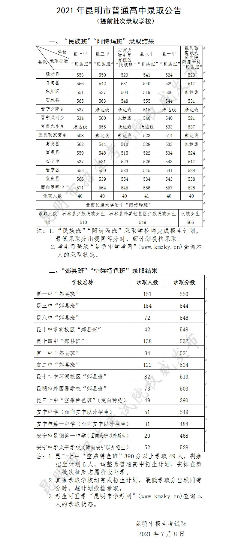 2021年昆明市普高錄取公告(提前批次錄取學校)