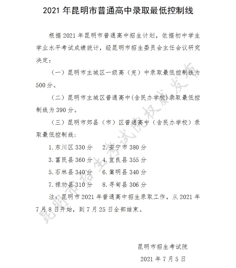 (二)昆明市主城區(qū)普通高中(含民辦學(xué)校)錄取最低控制線為390分。