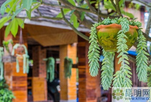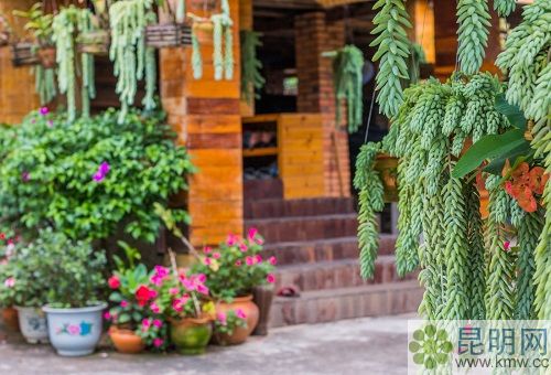 ​院子里種滿了各種當地植物,最吸引人注目的便是吊養在門口和門廊上的多肉植物,在花盆里吊下一串串飽滿又可愛的肉肉,非常討人喜歡。