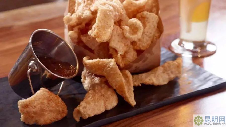 吃油炸豬皮就像是吃薯片一樣酥脆,刮去了肥肉的豬皮吃起來一點都不油膩,外表非常香脆。