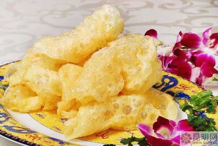 炸乳扇,這是乳扇較為普遍的吃法,即把乳扇放入油鍋內(nèi)煎炸片刻,待乳扇呈焦黃色后取出放入盤內(nèi),撤上白糖或椒鹽即可食用,吃起來芳香酥脆,鮮美可口。乳扇外形像我們常吃的炸蝦片,但與蝦片不同的是乳扇入口后有些微酸,焦脆可口、奶香濃郁,風味獨特、滿口余香。