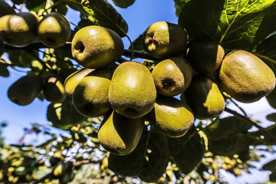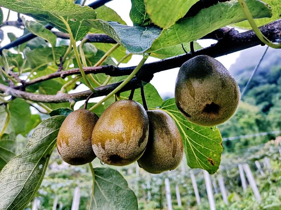 橢圓形、黃褐色的獼猴桃掛滿枝頭。