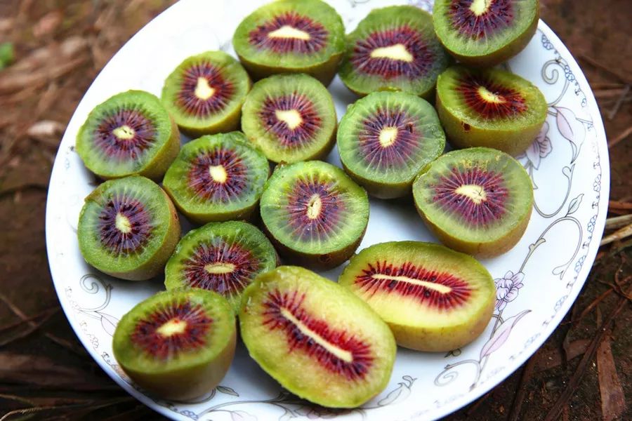 石屏縣獼猴桃品種以紅陽(yáng)為主,紅陽(yáng)獼猴桃鮮果橫剖面沿果心有紫紅色線條呈放射狀分布,似太陽(yáng)光芒四射,色彩鮮艷。果型中大整齊,果心小,果味濃,平均單重90克,最大可達(dá)200克,肉質(zhì)鮮嫩、香甜清爽。