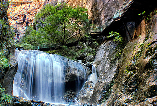 在峽谷的棧道上,抬頭仰望,兩翼群峰直通天際,懸崖峭壁直劈河中;望腳下,河水奔流,綠波拍岸。棧道上行走可與水聲相伴,宛如仙翁俠客穿越在深峽中的水面上。
