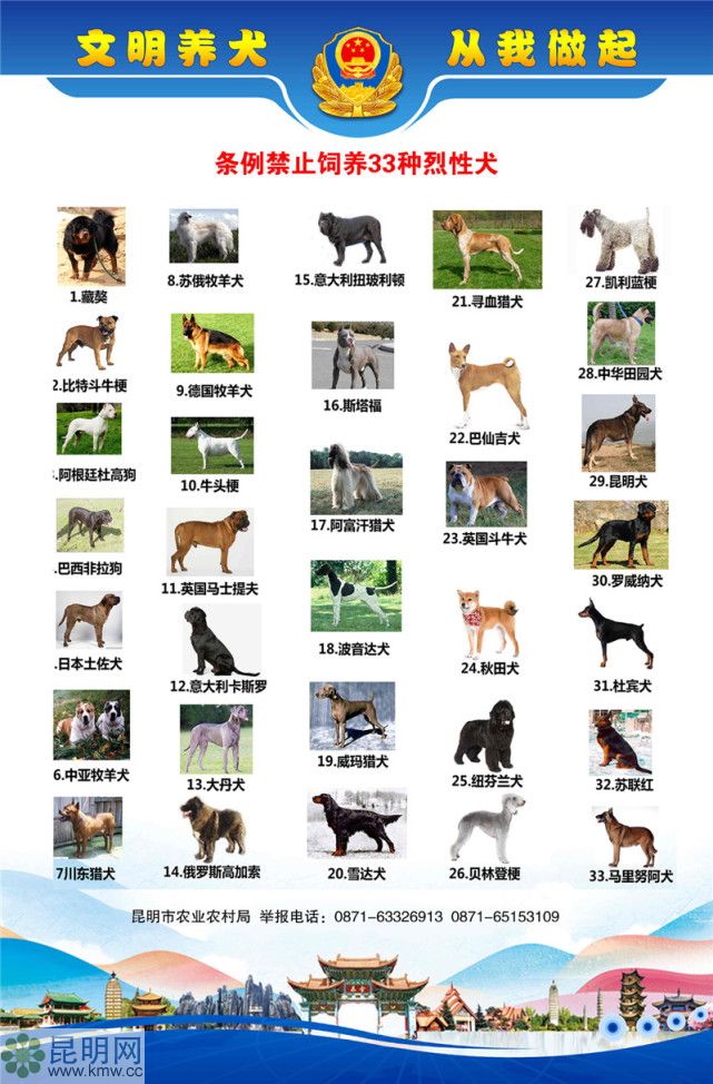 據了解,早在2008年昆明頒布實施的《昆明市養(yǎng)狗管理條例》,對市民圈養(yǎng)和收容各種犬有了明確規(guī)定。《條例》生效后,確認這33種烈性犬不能在主城區(qū)內飼養(yǎng):
