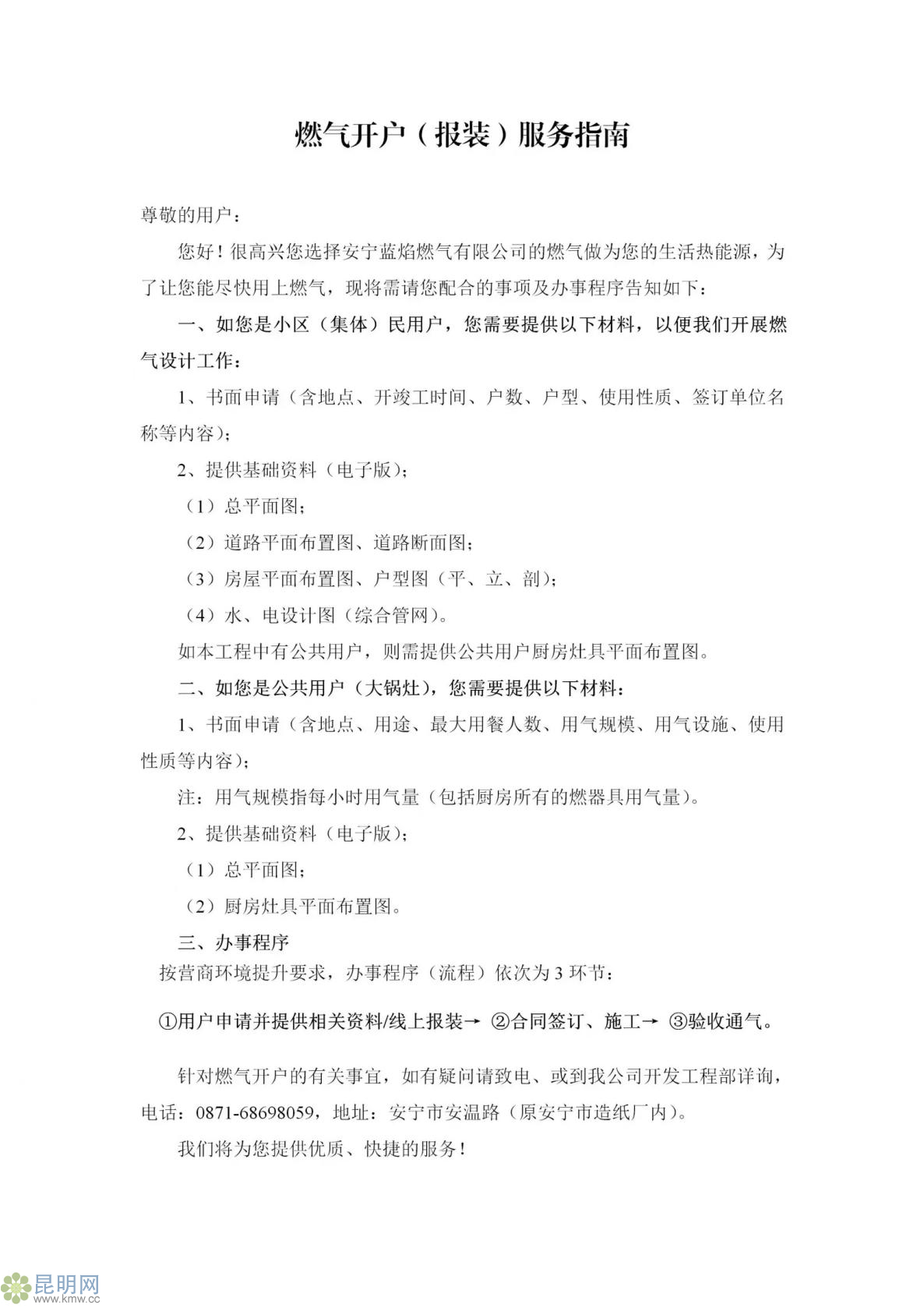 - 供氣范圍:安寧市行政轄區內的居民及非居民用戶。