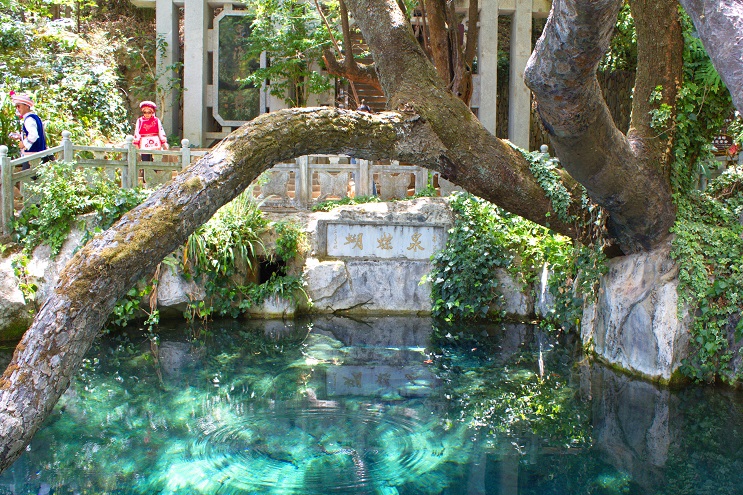 龍是中國的吉祥物,也是大理白族地區的崇拜圖騰之一。在白族地區,有山必有水,有水必有龍,而在這蝴蝶泉邊,五股清泉從龍頭噴涌而下,形成一個五龍吐水、浪花飛濺的奇觀,下方的五個小水潭,水花四濺,泉水透明清澈,形成“清泉石上流”的美景,這就是五龍池。在大理白族人民心中,五龍吐水寓意吉祥如意,所以凡來到蝴蝶泉,白族人民一定會到這里洗洗手,代表著將獲得健康快樂、美麗緣分和喜樂豐收。